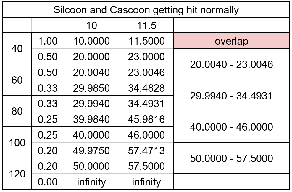 In the table below, you can see what Pokémon weight ranges Silcoon and Cascoon would receive different damage values from under normal conditions. Say an opponent with the weight of 43 were to attack Silcoon with Heat Crash, the attack base power would be 100. Meanwhile a Cascoon receiving the same attack would only experience an attack with a base power of 80.