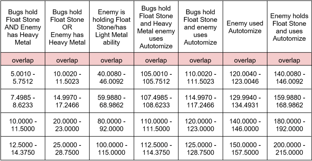 Now keep in mind we do still want to explore EVERY possible difference in a Pokémon battle so that includes obscure scenarios that normally would not happen. In doubles battles, you can easily transfer abilities of Pokémon onto others. So we will act under the assumption that every Pokémon has the ability to have Heavy Metal or Light Metal. In the end, we have a total of 8 combinations of possible scenarios where a weight falls into the appropriate ranges.
