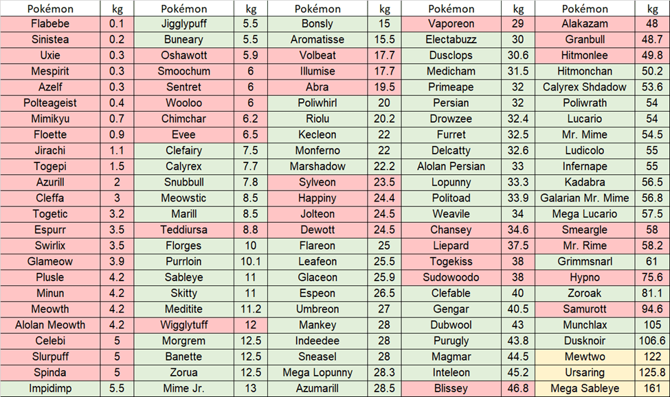 Basically, we will have to manually check for every Pokémon that can learn either Heat Crash or Heavy slam that has a weight that fits into one of the overlap ranges shown above. We will be able to limit ourselves to 5.1 kg through 115 kg. Any Pokémon above that should only be checked if they know the move Autotomize.