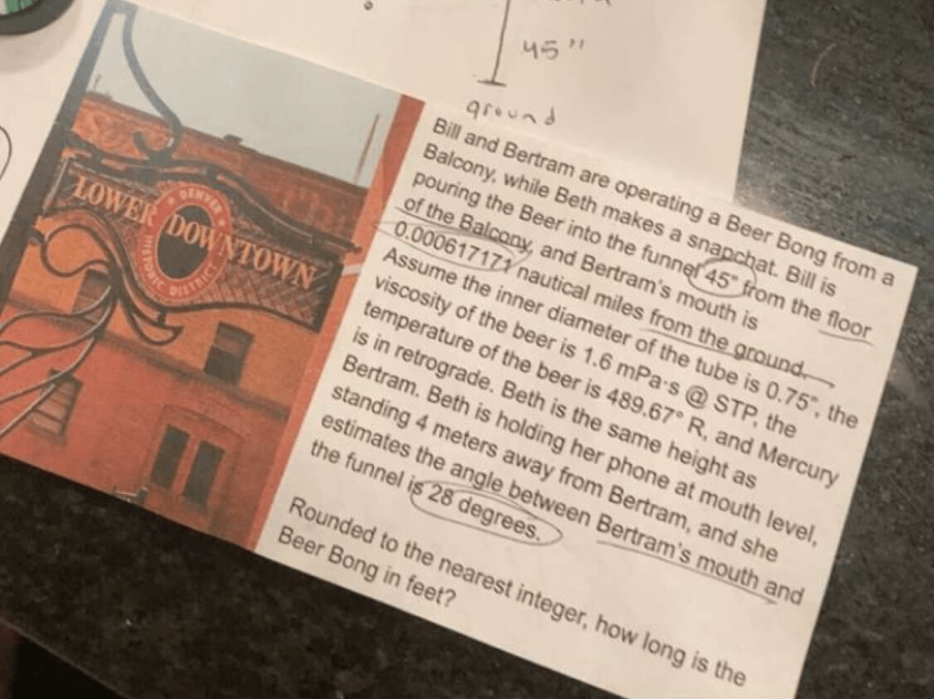 My friend sent me this picture while I was pooping the other day and being that I am always down for some fun math puzzles, I decided to give it a shot. At first glance it is very obvious there are extraneous bits of information thrown in that won’t necessarily help me find the answer. But let’s entertain the idea that we can glimpse some info and see if they are applicable in any way. The beer’s temperature is 489.67 °R, which is 30 °F. This is right above the freezing temperature of beer which is 28 °F. Given that ice cannot make a drink colder than 32 °F (at least not normal ice placed within the drink), we are to assume it is the cold temperature of the outside that has cooled the drink to 30 °F. The picture shows a sign of Lower Downtown Denver Historic District. So going off of some year-round temperature charts of Denver, Colorado, we can see that the outdoor temperature is roughly 30 degrees in March on average. Mercury is not in retrograde currently in 2023 and does not begin till April. The last time Mercury was in retrograde in March was in 2020. So we have isolated this scenario to the year and approximate time of year. Next, we take a look into whether the fluid properties are of any use. Given that there are no time units, we cannot effectively use flowrates to determine length of travel. So the diameter dimensions doesn’t seem to be useful (I do want to note the diameter appears to be consistent with typical beer bongs I’ve researched, which claim to be at max least an inch in diameter). So far these pieces of information do not seem helpful. So let’s continue.