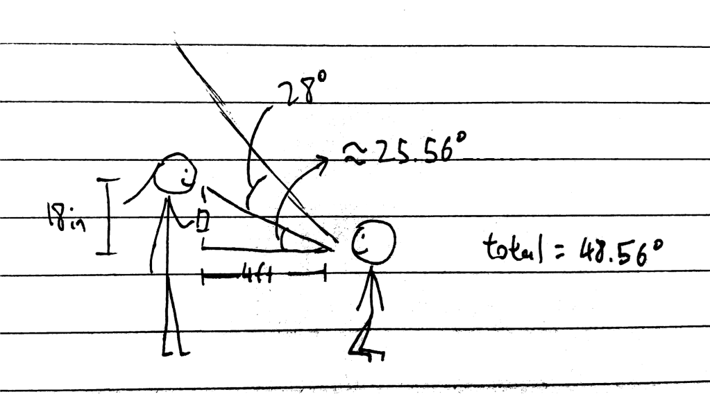 So what Beth perceives as 28 degrees means the actual angle of the mouth to funnel is probably more like 49 degrees… is what I would say if it weren’t for a crucial fact we’re missing. The problem says mouth to funnel, in which the funnel is at the top of the beer bong being held by Bill. In this scenario this angle is thus irrelevant because the tube is not straight and the funnel can be held at a large variety of angles and we still would not have a better sense on the actual length of the tube. Besides, we still have no information regarding Bertram’s location in respect to Bill.