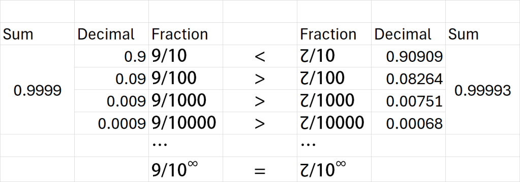 For example consider a base eleven (undecimal) counting system where between 9 and 10, we had a new number called ↊. So in this scenario, ↊/10 in undecimal is greater than 9/10 in decimal. So wouldn’t 0.↊↊↊… in undecimal presumably would be a closer approximation to 1 than 0.9999… is in decimal? How can both equal to one?